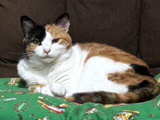 面白い事に近所の三毛猫は 模様が対象で