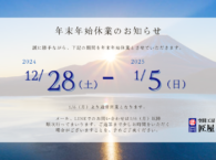 | お知らせ平素は格別のご愛顧を賜わり、厚くお礼申し上げます。 誠に勝手ながら、下記日程にて、年末年始休業とさせていただきます。 ■休業期間 ...